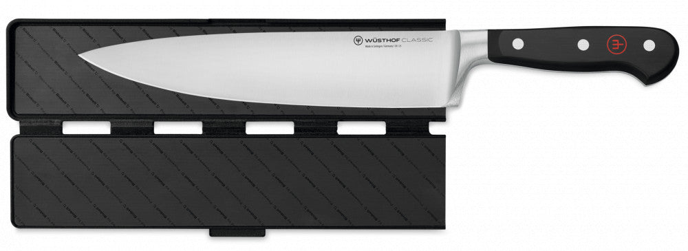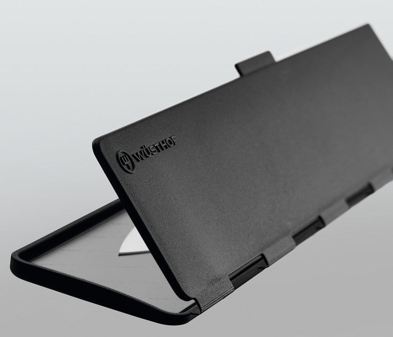The magnetic Wüsthof blade guard ensures safe storage of knives, protecting them from scratches and damage. This hinged blade guard is easy to open and magnetic, allowing for secure closure.