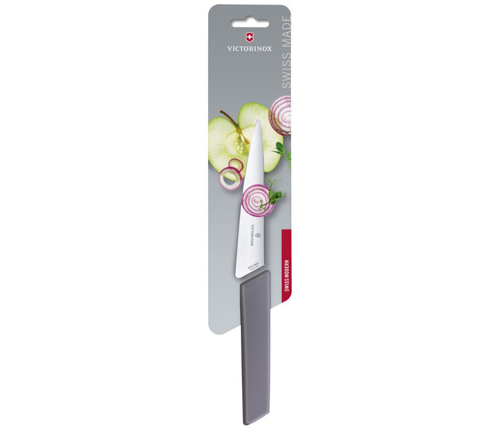 Sleek kitchen knife with synthetic handle. This compact, traditional kitchen helper cuts ingredients with ease. With its slim, precisely pointed blade, the 15 cm Swiss Modern household knife is well suited for meticulous tasks such as peeling, stemming or core removal. For this, the brand new Swiss Modern collection has a super slim, fashionable synthetic handle instead of the traditional walnut. It is easy to clean and can be put in the dishwasher for daily use.