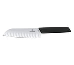 Victorinox Swiss Modern Santoku with 17 cm long ribbed blade and black handle.